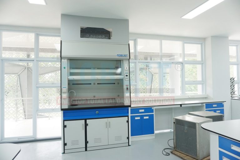 - Dilengkapi sistem ventilasi atau fume hood, eyewash station, shower darurat, serta penyimpanan bahan kimia berstandar keamanan.