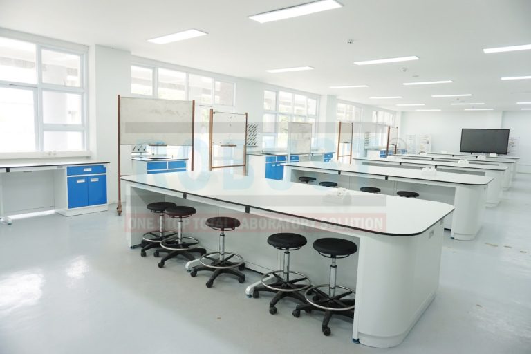 - Meja praktikum dan kursi didesain dengan tinggi yang ergonomis untuk usia siswa/mahasiswa, dilengkapi permukaan tahan bahan kimia.